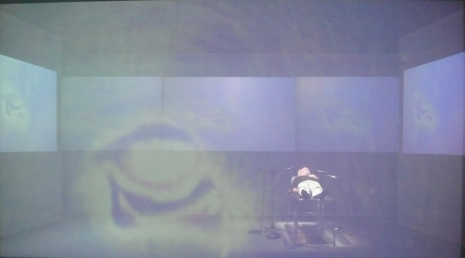 Another of the characteristics of the cycle is the particular attention paid to sound creation, each time entrusted to a different artist: in this case, Paul Wirkus's live musical performance immerses him even more in a final atmosphere of irremediable nostalgia. The face projects, like the amplified breath of the performer, fringes in silent memories and introspections, in a desolate hand-to-hand fight with death trying to kidnap air from elusive life.
