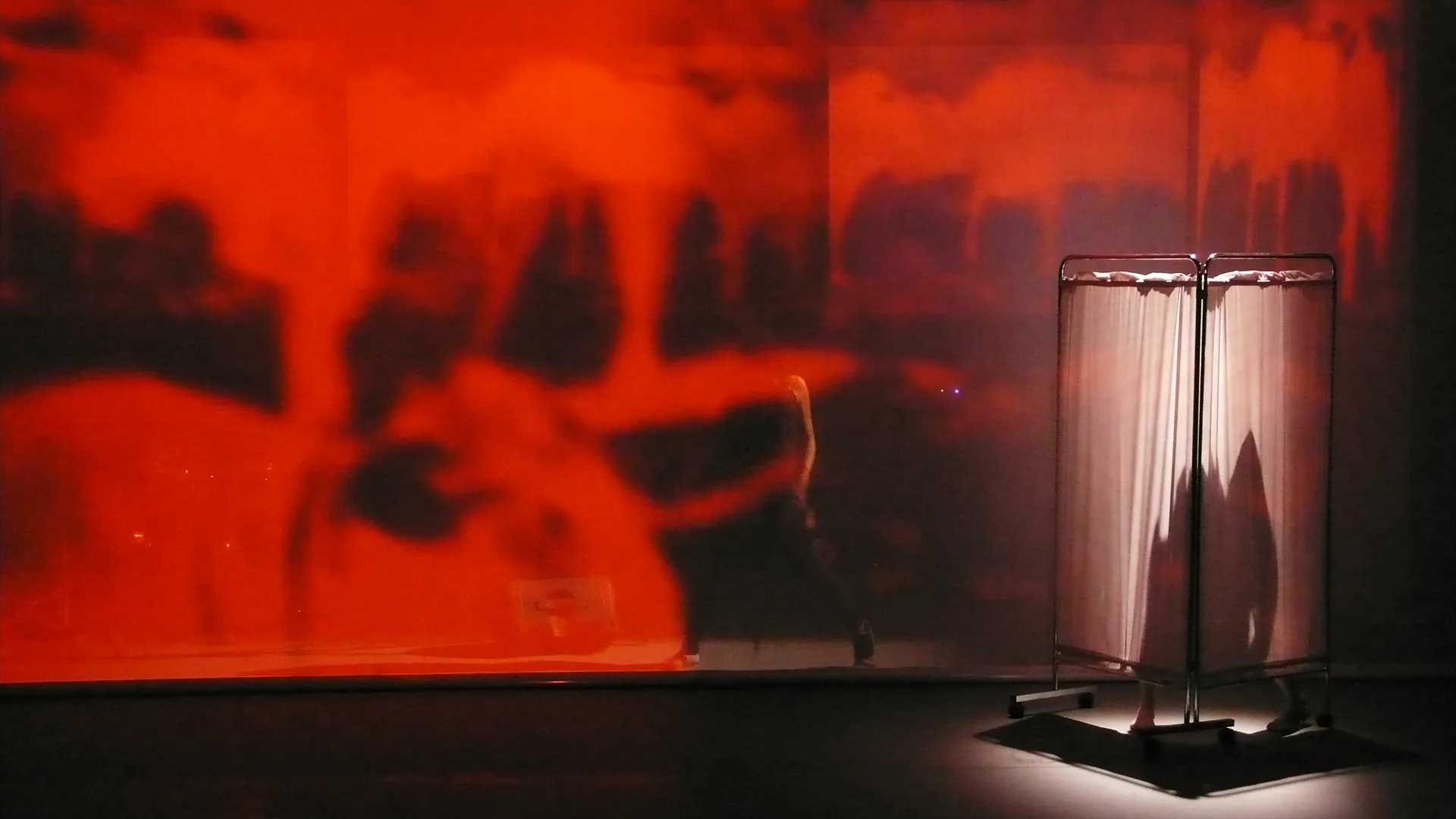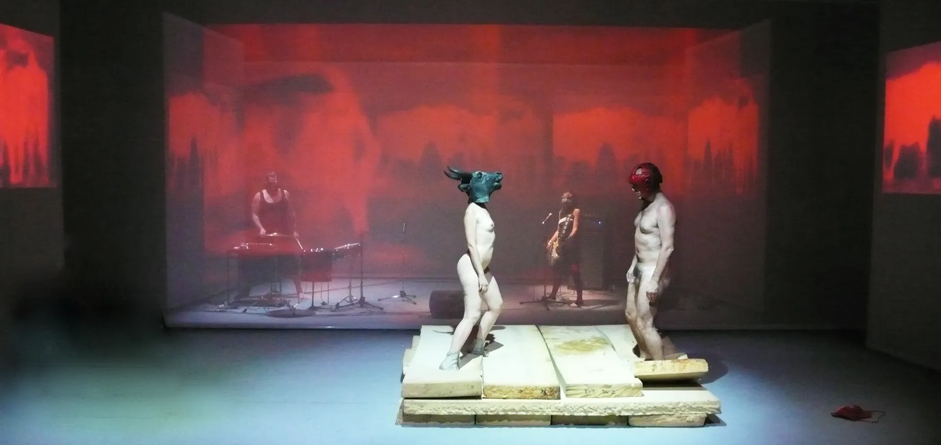 In the perimeter space of the Ara Pacis, a celebratory and propagandistic monument erected in the Campus Martius between 13 and 9 BC to glorify the Augustan victories and, during the Fascist years, the site of the gymnastic exercises of Roman youth - exactly reproduced from the installation, the first six ceremonial paintings inspired by the Aeneid are drawn. The walls of the stage enclosure are decorated with the visual friezes of the film sequences in substantial formal fidelity to the narrative structure of the friezes of the Ara Pacis, an explicit ornamental redundancy that connects the imperial present and Aeneas, the mythical progenitor of the Roman lineage.