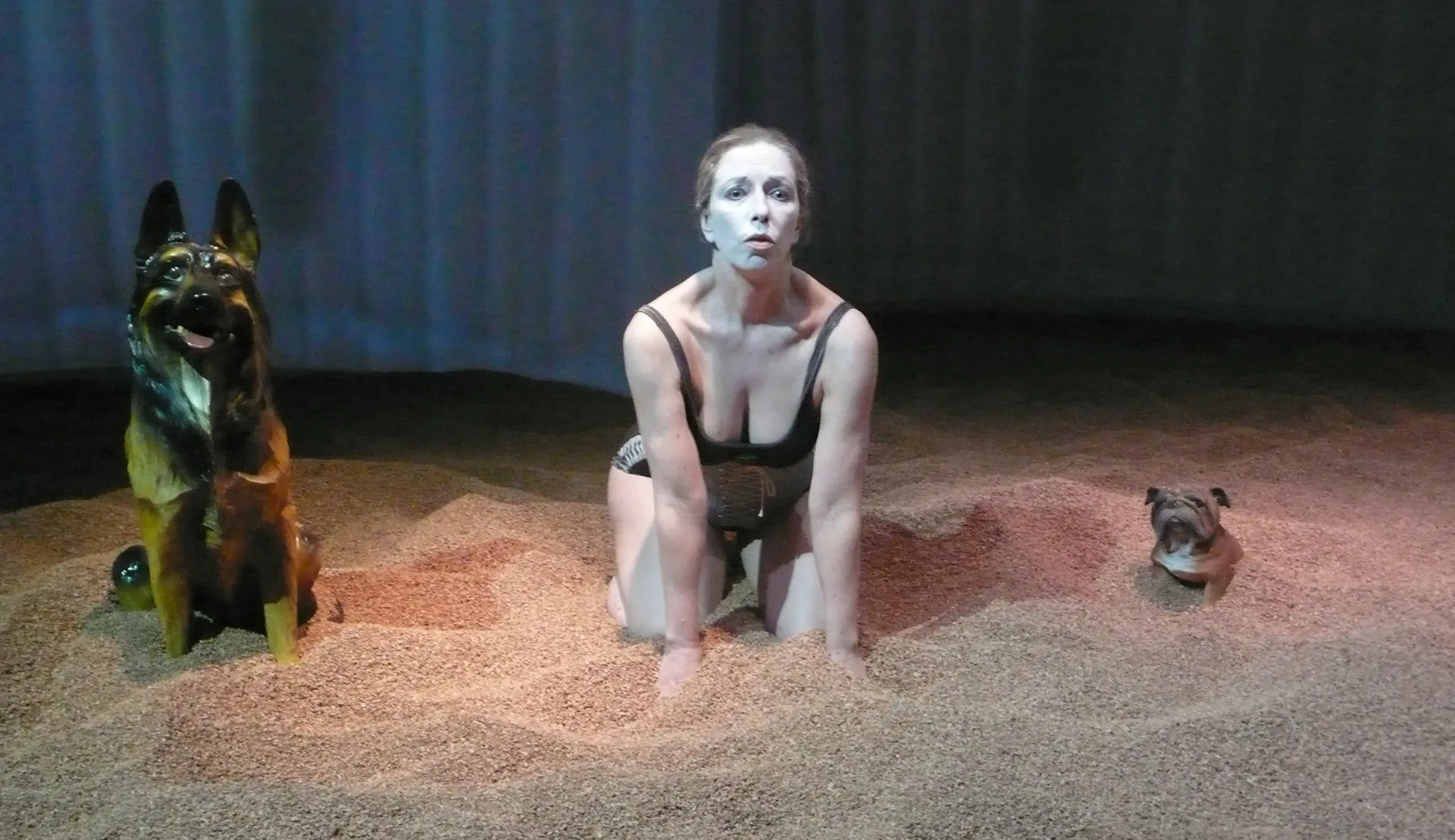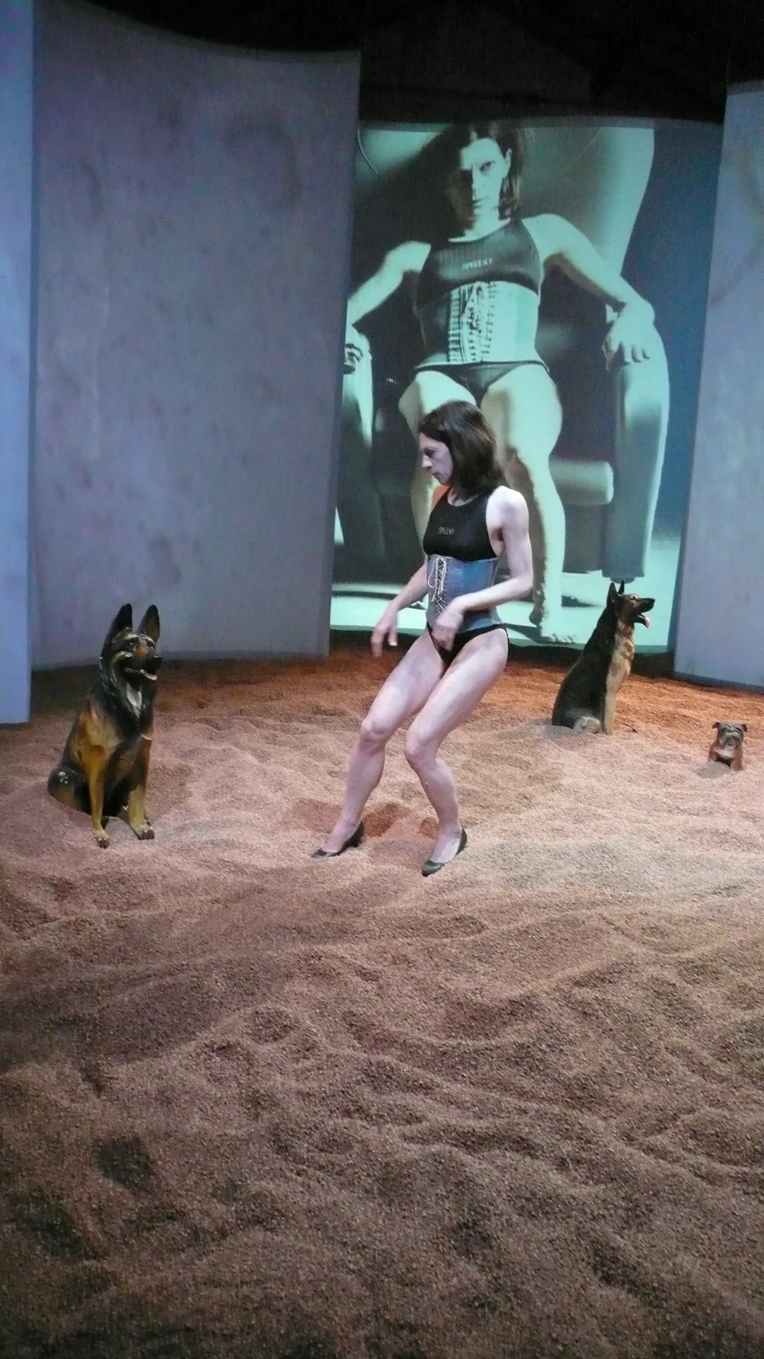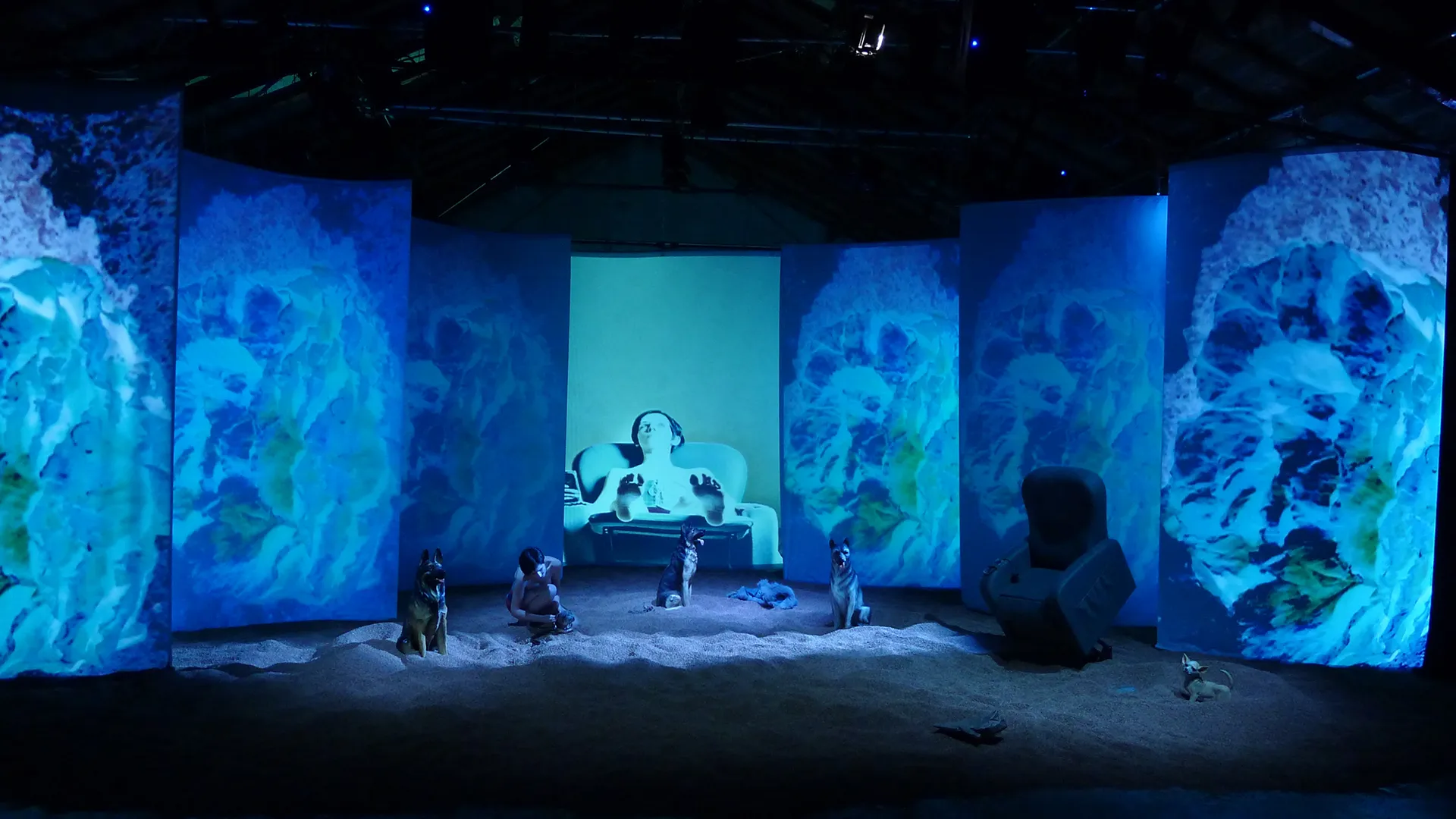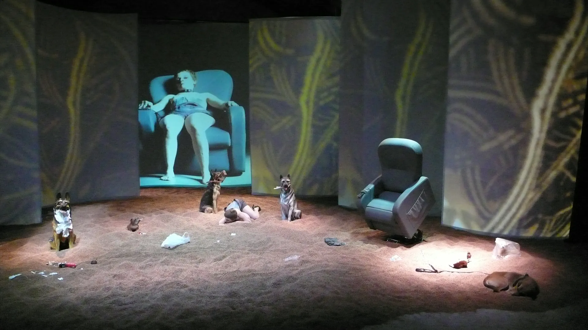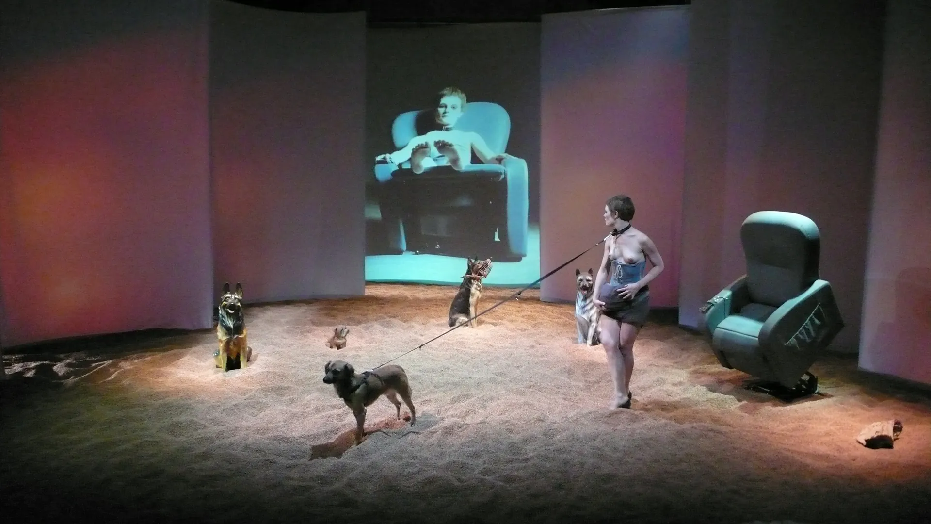 The work, conceived in five scenes, all in the female form, is structured in a succession of autonomous dramatic and visual landscapes. On stage, five contemporary Sibyls superimpose the crisis and sterility of the West on the sentimental puzzle of their existence, living their total solitude in the company of five dogs, the only inhabitants of the Isle of Dogs, a wasteland on the edge of the big city (a real peninsula in London's East End in the former Docklands shopping area) from which they are dismayed to observe themselves and the remnants of the world around them.