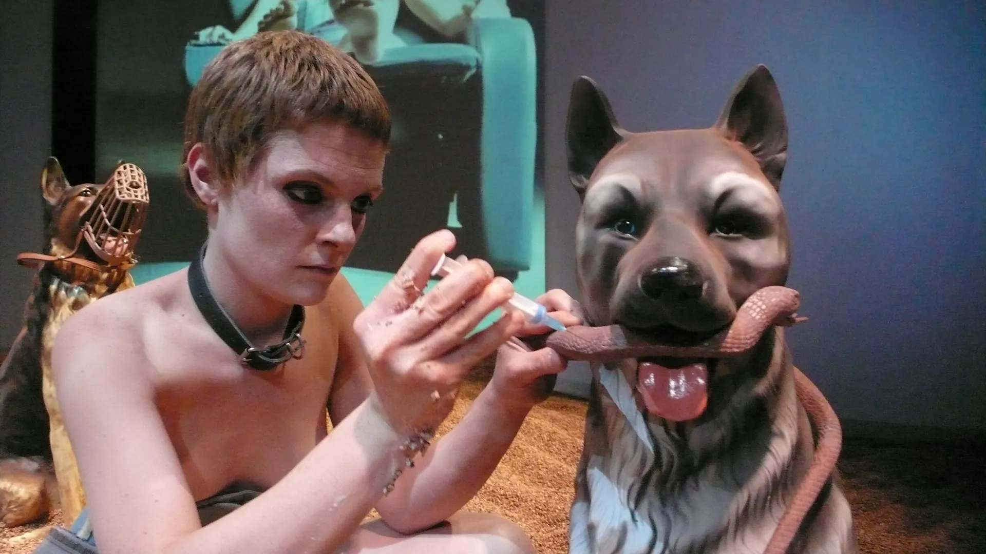 A throne/altar for the body to be displayed in prophecy – a reclining machine that moves the elderly, impotent human, stretched out to look at the existential waste that makes up the puzzle of his life – is the place from which to announce the unanswered enigma of the present time. Like silent letters to be deciphered, the Icon Dogs are the guardians of the temple, immobile companions of the five talking, copulating, reasoning bitches and finally a real Dog, animal, friend and faithful beyond the intellect.