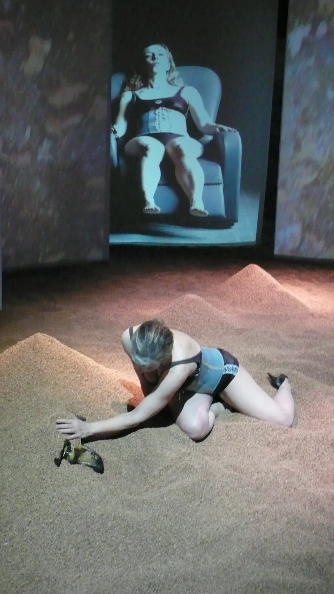 At the centre of the stage vault, the purposeless flow of elements is interrupted by a macro-icon, a depiction of the five sibyls, reverent to Michelangelo's classicism of the Sistine Chapel and at the same time of Beckettian drift (Dondolo) due to that uninterrupted movement of the electric armchair in which the five women sit, a self-propelled throne and the only plastic element present on stage.