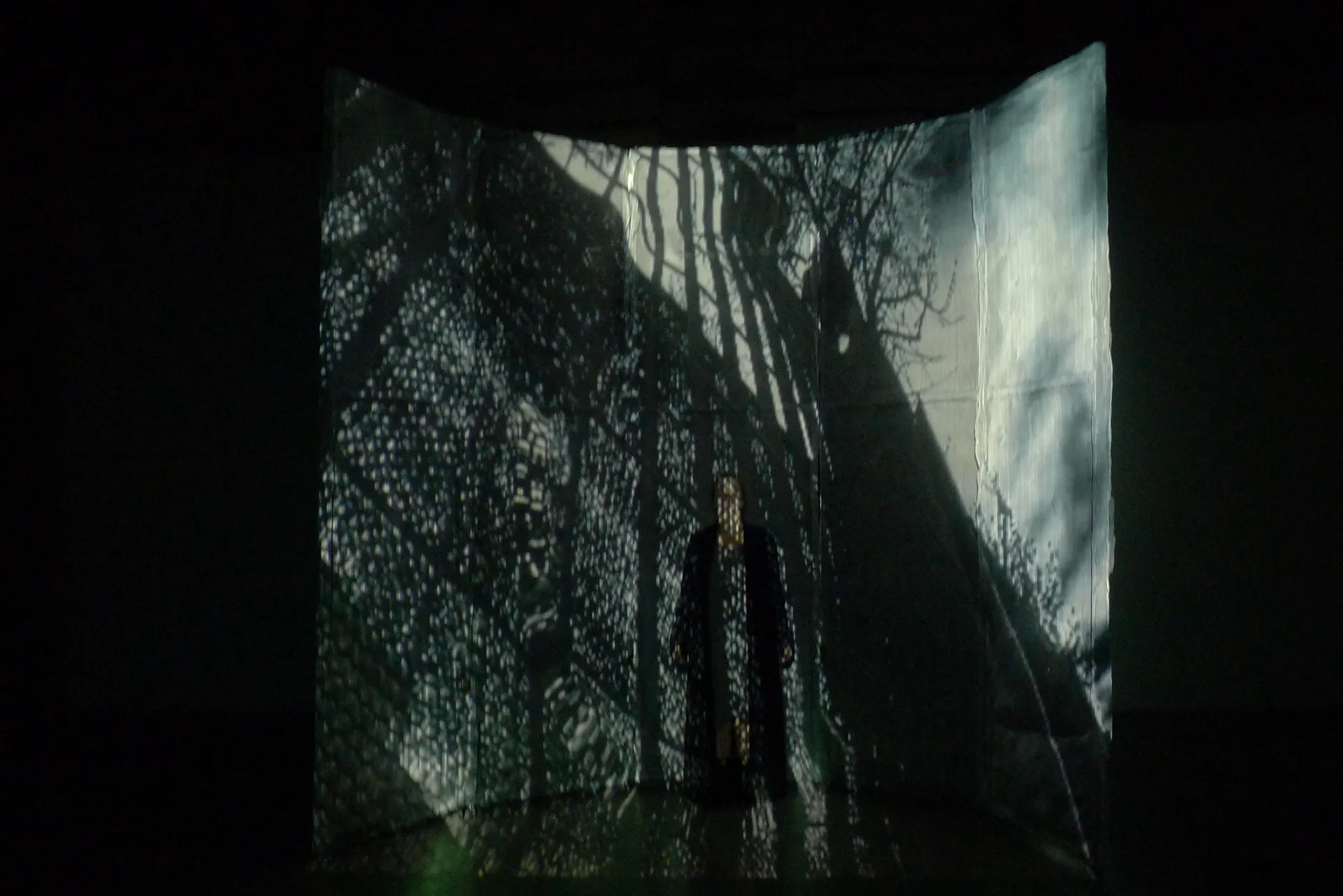 Having placed Shakespeare's Macbeth as an investigative text then brings the questions directly to the centre, to the completion of a decisive action, of a decisive fact for the biography of the actor and the protagonists of the drama: “I did it, the fact. I heard the owl screaming and the crickets watering. I think I heard: Sleep no more! Macbeth killed Sleep, innocent Sleep.” Delirium, guilt, visions, and death are paragraphs of a lived, textual life that overlap within a crystal ball where destinies, witches, and blood rain down from above like snow, after turning the ball upside down and restoring its shape. The actor then truly becomes the crystal image of his past and present, the verses of Macbeth and the Lady, as well as those of the witches seem to emerge, with unknown and only minimally correct technique, like knife blades circling real and not fragments of a delirious dream. The real and virtual long-distance dialogue between the actor detained in his place/castle and the actress performing on his stage becomes an exchange of voices and whispers between two contemporary Pyramus and Thisbe; the two lovers and accomplices are distant, and in between lies the wall of civilized life and real society.
