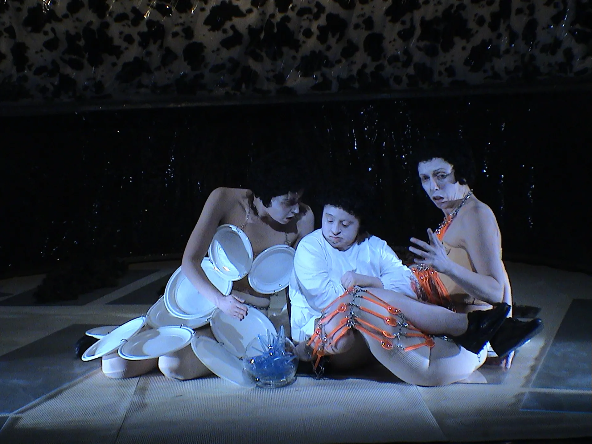 It is in the finale that, with the gigantic shears and the meat slicer raised high like trumpets of Judgment, the paternal and maternal instance, from one jamb of space to another, open the scene to the Future, in the service of baroque angels who separate the curtains on the Secret. It lies, finally obscene, in the center, in the subsequent historical afterlife, and thus exposed, Tristan and Inane, it reveals the background to the outing as the "Last Supper", which never ends because the Victim is always renewed.