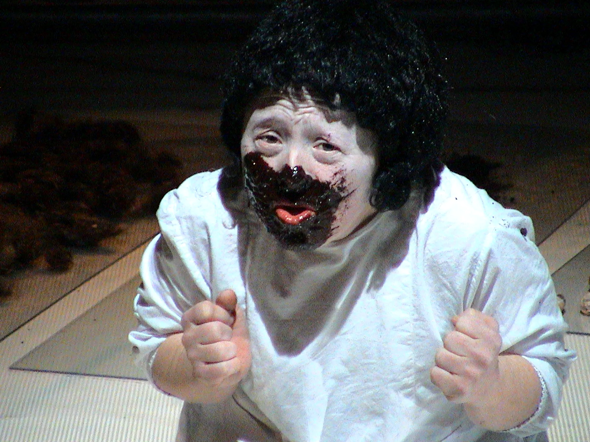 But there is a luminous and numinous element, in the scene of POLLICINO, which passes through any perspective projection and contrasts it - absolutely - as an "apparition". It is the physical body in which Tom Thumb is incarnated: the abnormal body of down-actress Barbara Voghera, so often at the centre of LENZ's directorial choices, a hermaphrodite who carries antithetical dramatic identities, from Hamlet, in particular, to Little Red Riding Hood. Numen in vita, theatrical theatrical toy, Christic body: no representative machine, no fictitious character who finds breath, voice and movement in it, can remove from this physiognomy and from this "other" body the very symbolic of Destiny: even before embodying any dramatic story, they are the Meaning.That Meaning plays another part in itself is a marvelous fact par excellence, therefore intrinsically "theatrical": every moment of the presence on stage of this body sacralized by its natural mark is therefore a document of meta-theatre.It is no coincidence that so often in the operations of the LENZ and also in the POLLICINO it is subjected to martyrdom or obscene exposure: the whole problematic of the Sacred converges in the Monstrum and the fact that this assumes, in the recitative discipline, a potentially infinite series of masks, makes its historical and organic existence a living allegory, that paradox of Dionysian mysteries whereby the actor must remain untouchable and untouched in the exact circumscription of his own aura, or he will be killed.